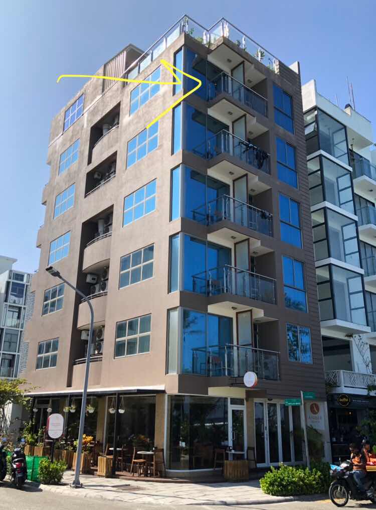 The Amber Beach Hotel, where we are staying. Our room is marked by the yellow arrow.