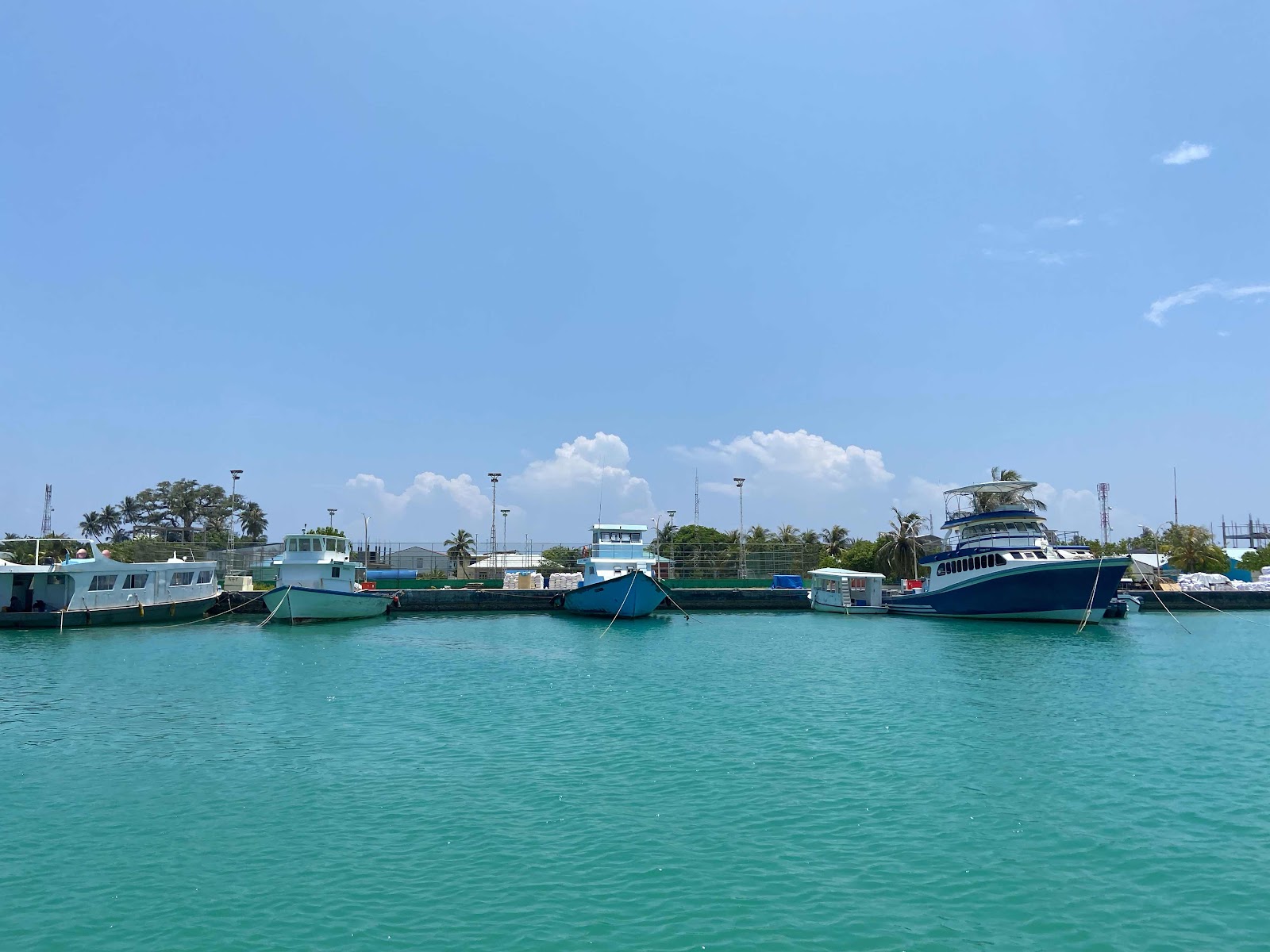 Traditional Maldivian dhonis (wooden boats) in the port at Huraa.