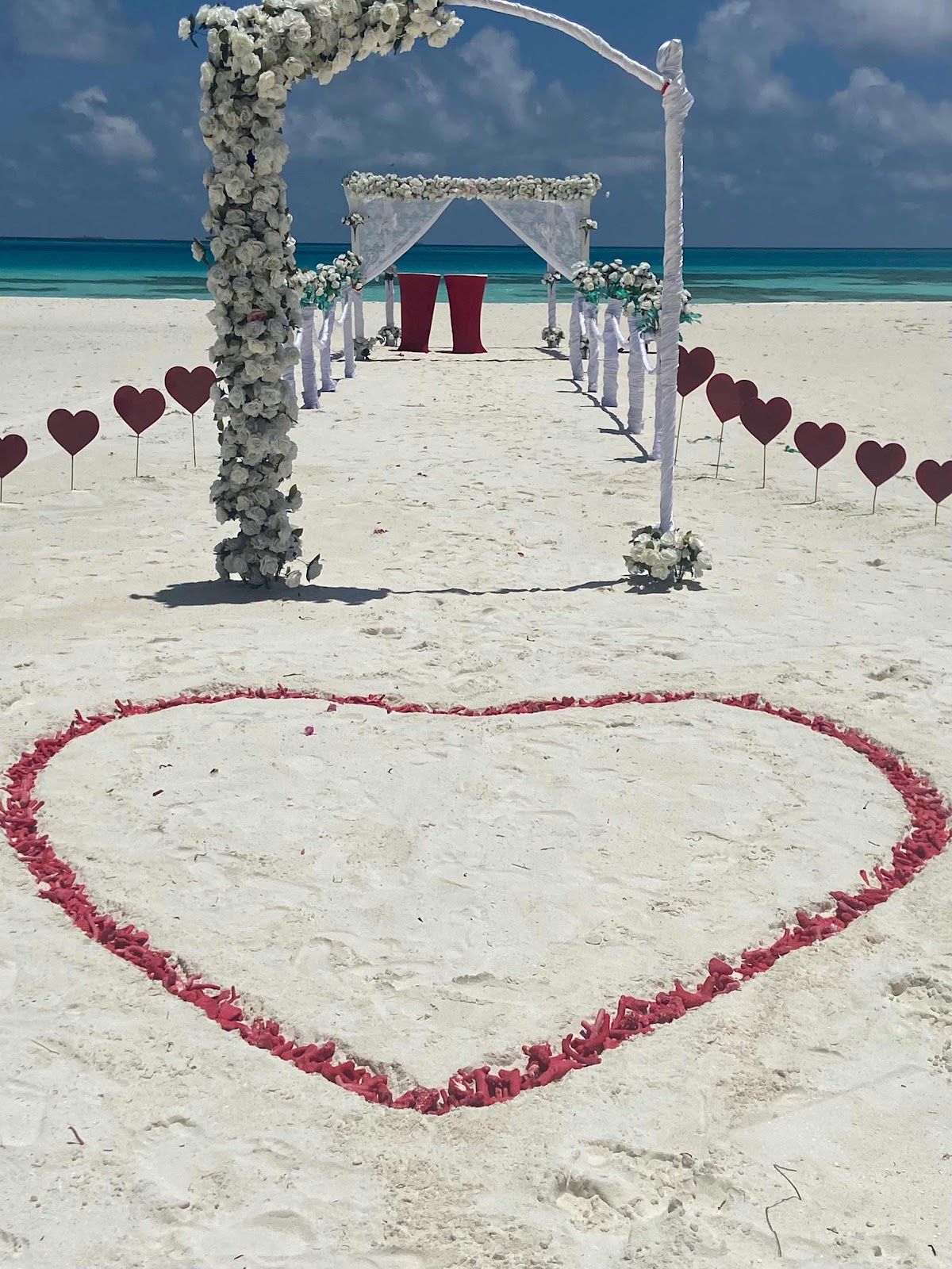 As with many places in the Caribbean, the Maldives is a destination wedding location. Here, the staff have set up for such a wedding on the main beach on the island’s southeast corner.