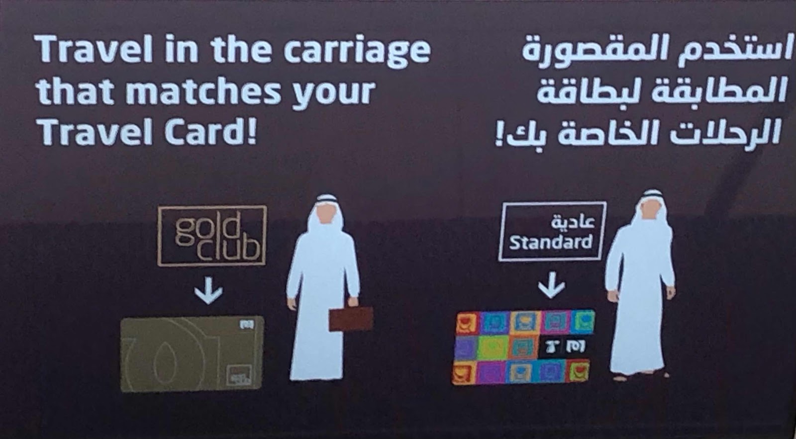 The Doha Metro has three classes: Gold, Family and Standard. Men are only allowed on a Family car if traveling with a woman and at least one child.