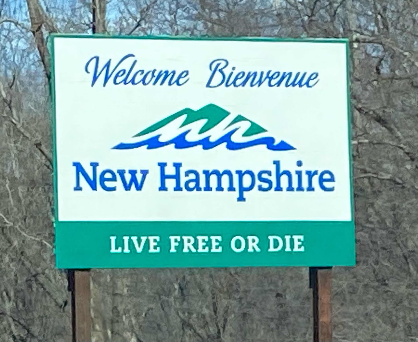 Welcome to New Hampshire sign on the New Hampshire - Massachusetts state line. A very gutsy slogan for such a small state.